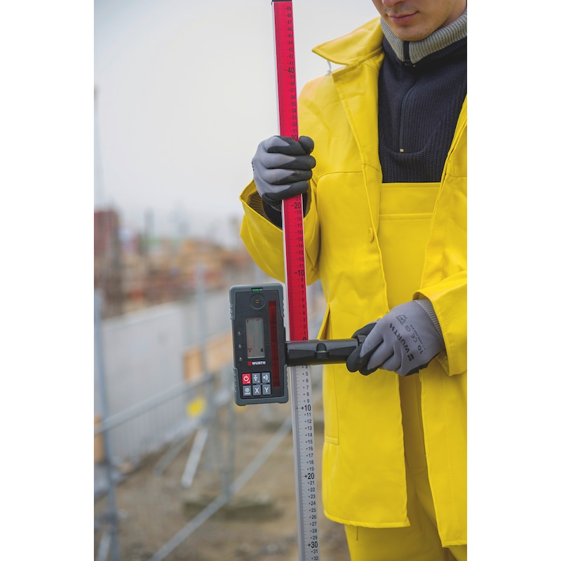 Laserový prijímač s milimetrovým indikátorom pre rotačný laser s držiakom na meraciu tyč.